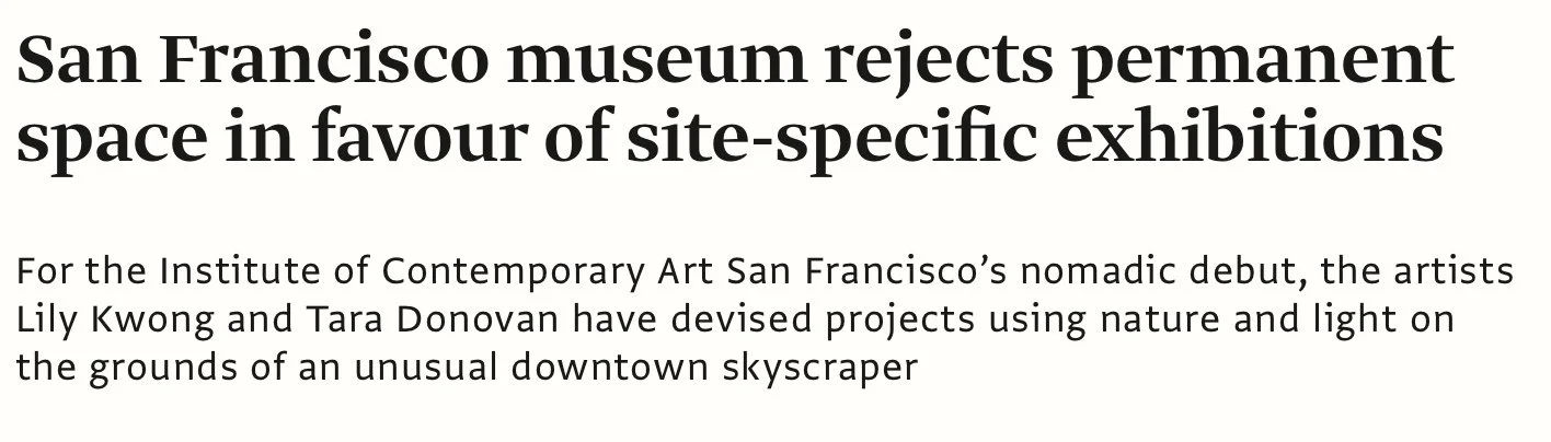 San Francisco museum rejects permanent space in favour of site-specific exhibitions Mar 23 Written By Pamela Coddington Pamela Coddington